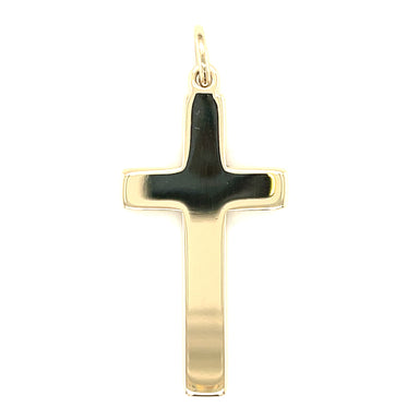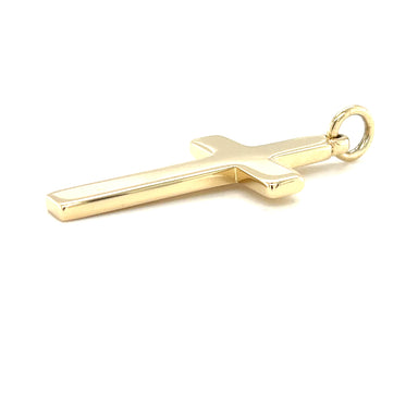 A pre- owned 9ct yellow gold cross pendant. Plain polished with a swing bale allowing it to be worn on a chain up to approximately 6mm wide. Unisex...