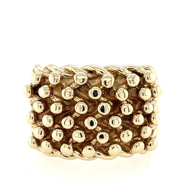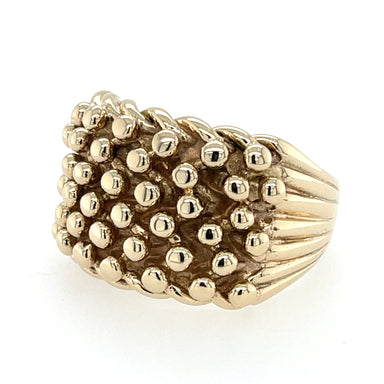 Pre- owned. A 9ct yellow gold classic keeper ring. This solid plain polished example comprises six rows of shot balls with rope edges. Grooved shou...