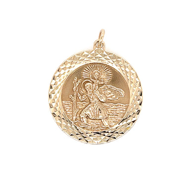 Pre- owned round St Christopher pendant made of 9ct yellow gold. The traditional motif of St Christopher assisting the traveller is raised with dia...