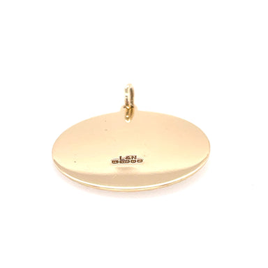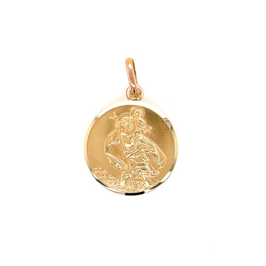 Pre- owned round St Christopher pendant made of 9ct yellow gold. The traditional motif of St Christopher assisting the traveller is raised with pla...