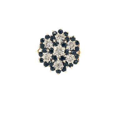 A 9ct yellow gold sapphire and diamond cluster dress ring comprising thirty one round cut blue sapphires and seven small round cut diamonds, claw s...