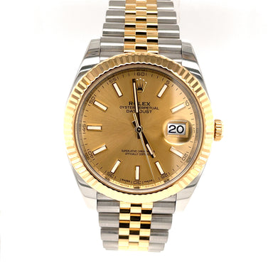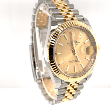 Pre-owned Rolex Datejust 41, model reference 126333. Stainless steel and yellow gold 41mm watch case, champagne baton dial with date, automatic mov...