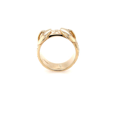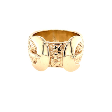 A double buckle ring made of 9ct yellow gold, featuring back to back buckle design with engraved detail across the remainder of the ring. Solid go...