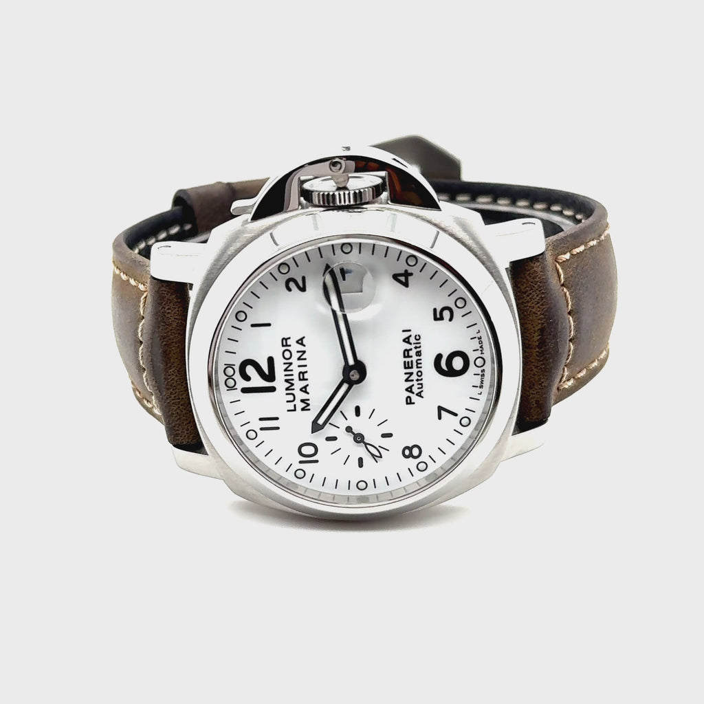 Pre- owned. PANERAI Luminor Marina model reference PAM00051. Stainless steel 40mm watch case, white Arabic dial with date, polished bezel, automatic Panerai calibre OP111 movement, fitted to a Panerai brown leather strap with buckle fastener.