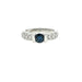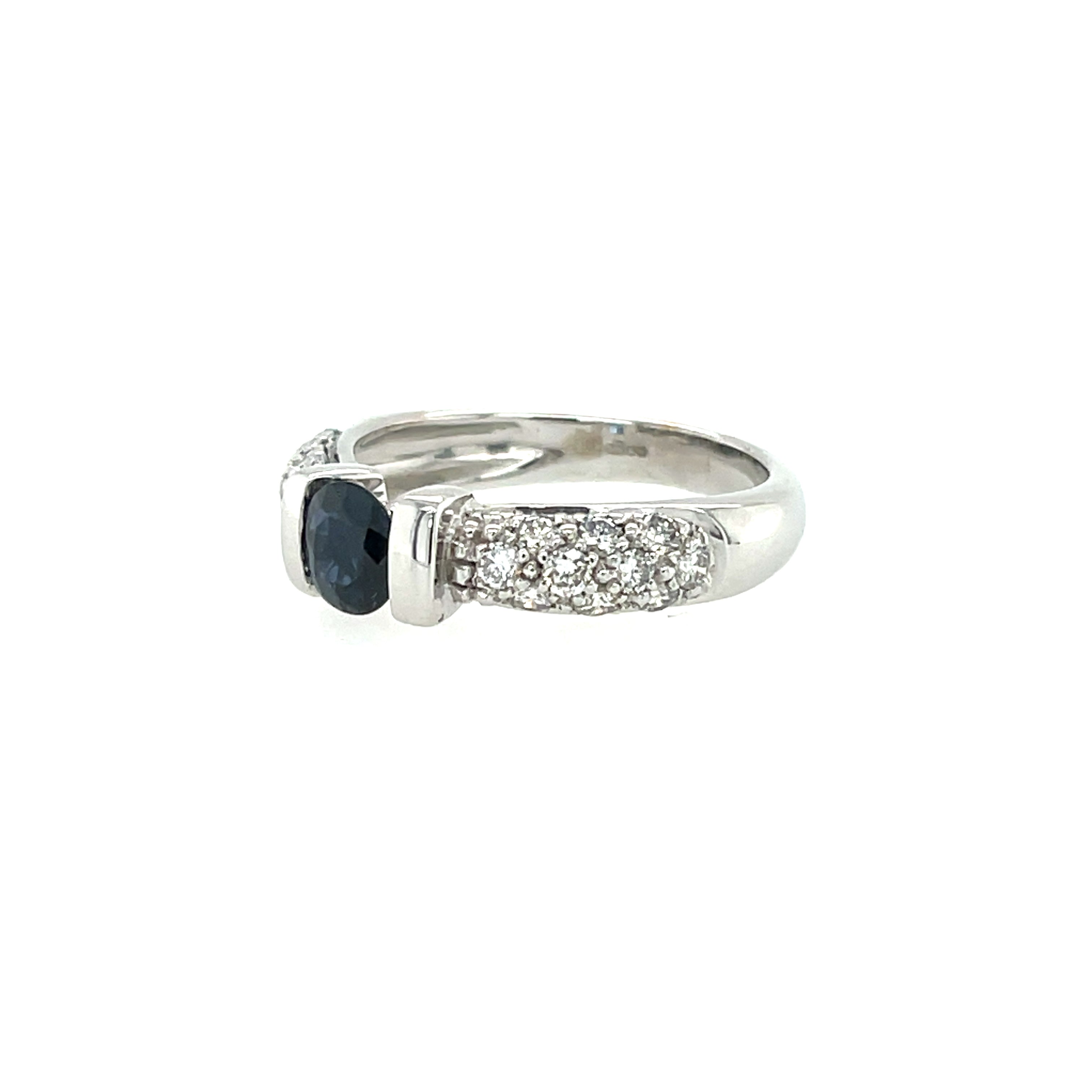 Comprising a 0.63ct round cut blue sapphire, tension set in a chunky two bar setting. Pave set diamond shoulders extend to a slightly tapered 3mm wide band. The shoulders are set with twenty round brilliant cut diamonds in total.
