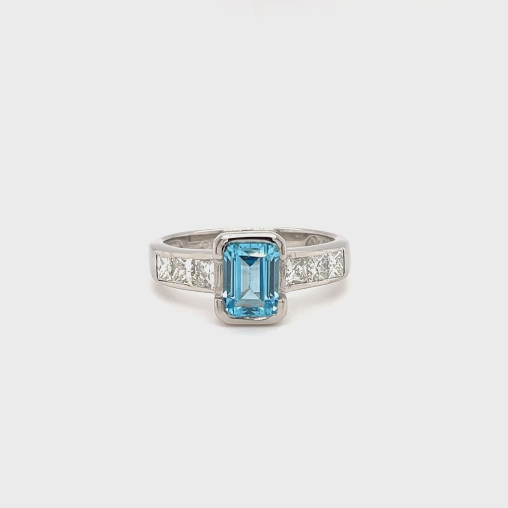 Comprising an emerald cut mid blue aquamarine approximately 1.00ct in weight, mounted in a semi open tension setting. Each slightly tapered shoulder is channel set with three square brilliant cut (princess cut) diamonds, extending to a 3mm wide heavy gauge band.