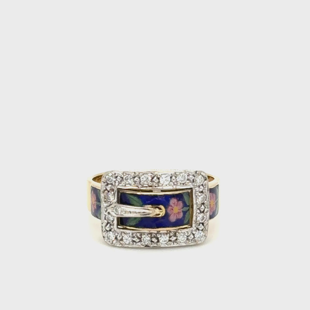 18ct Yellow Gold Vintage Diamond Enamel Buckle Ring