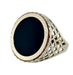 Pre- owned. A 9ct yellow gold black onyx ring. A polished round disc of black onyx is set in a coin ring style mount with diamond cut bezel. Lattice cut out shoulders extend to a 3mm wide band.