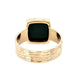 Pre- owned. A vintage 1971 9ct yellow gold bloodstone signet ring. Comprising a square tablet of green bloodstone with slight red flecks mounted in a square setting with soft edges, set raised onto a 7mm wide flat band. The band and setting feature an engraved bark effect detail.