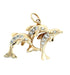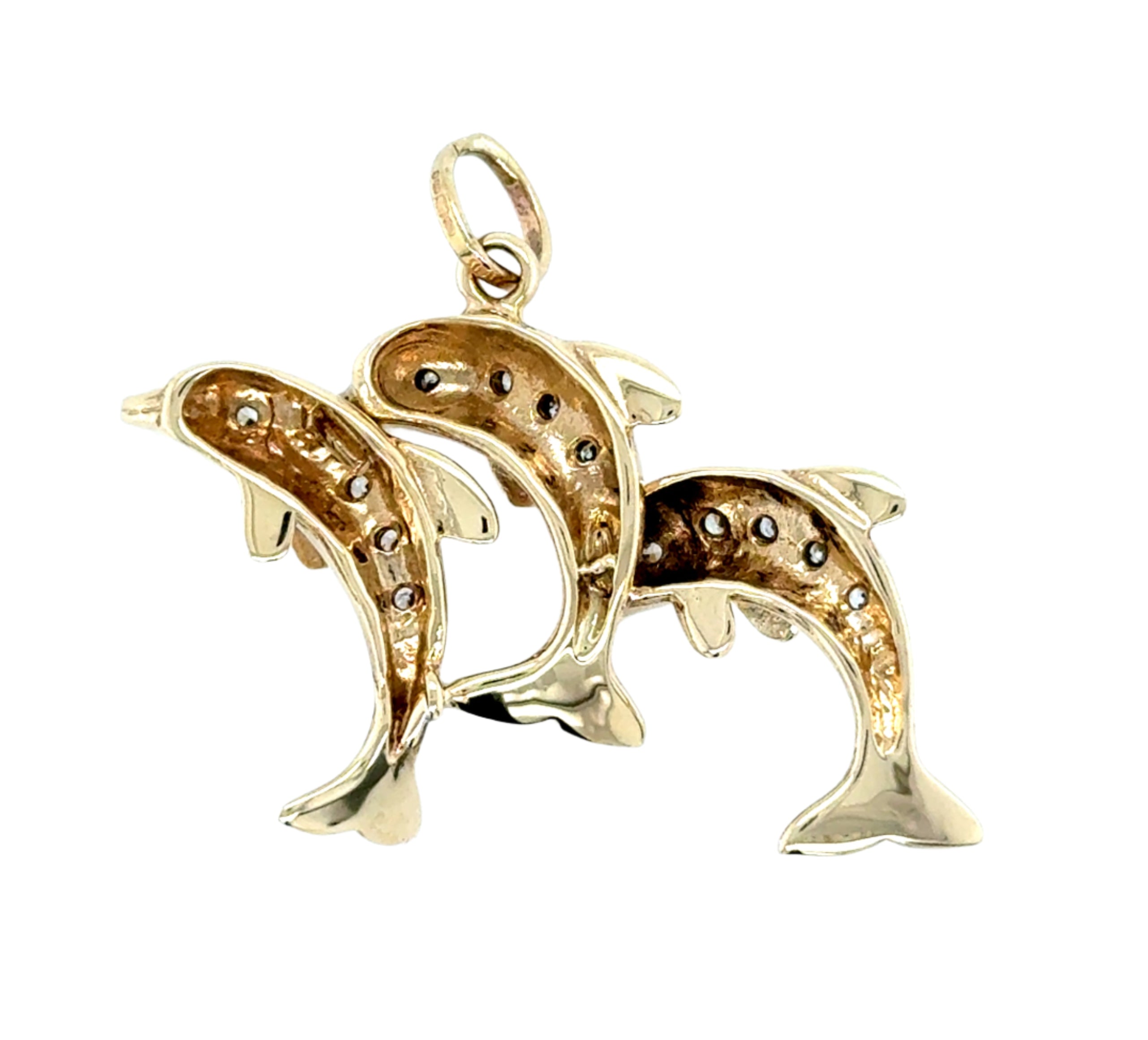 Pre- owned. A 9ct yellow gold dolphin pendant. Three leaping dolphins are set with white cubic zirconia (CZ) stones to the eyes and body. Fitted with a loop bale allowing it to be worn on a chain up to 4mm wide.