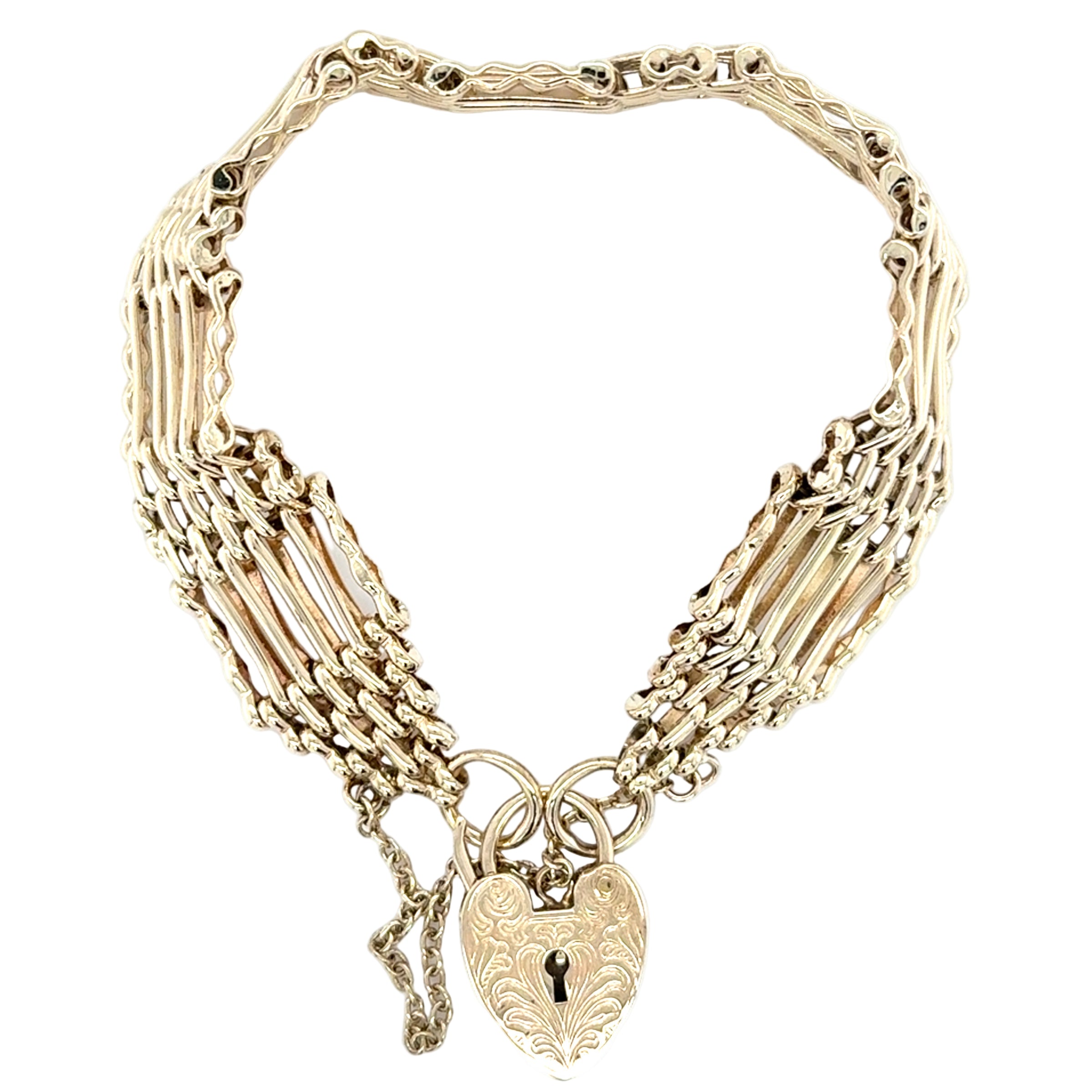 Pre- owned. A vintage 9ct yellow gold gate bracelet circa 1972. Comprising solid plain polished gold bar links forming square sections in a repeating pattern. The main sections are six bars wide with tapered ends. Secured by a decorative heart padlock fastener with additional safety chain.