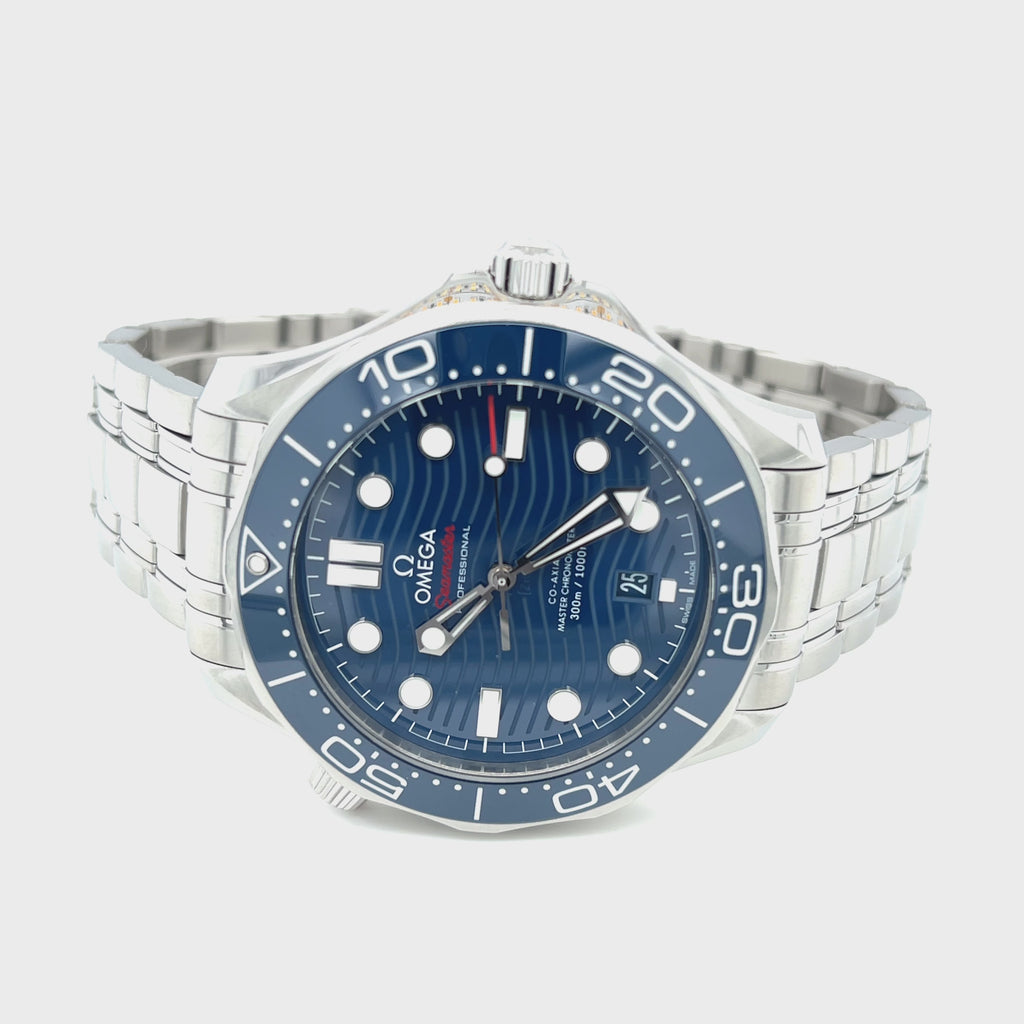 Pre- owned OMEGA Seamaster Diver 300M CoAxial Master Chronometer watch, model reference 210.03.42.20.03.001. Stainless steel 42mm watch case, blue baton dial with date, automatic coaxial movement and exhibition case back, fitted to a stainless steel bracelet strap with deployment clasp.