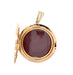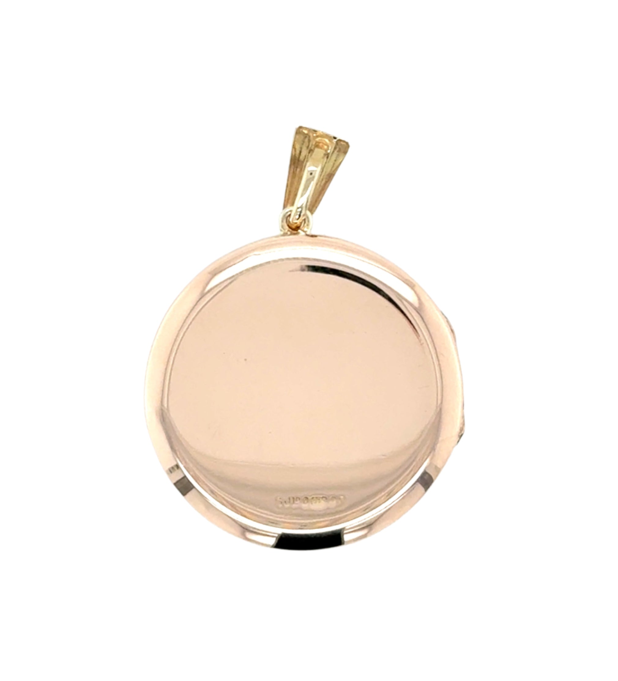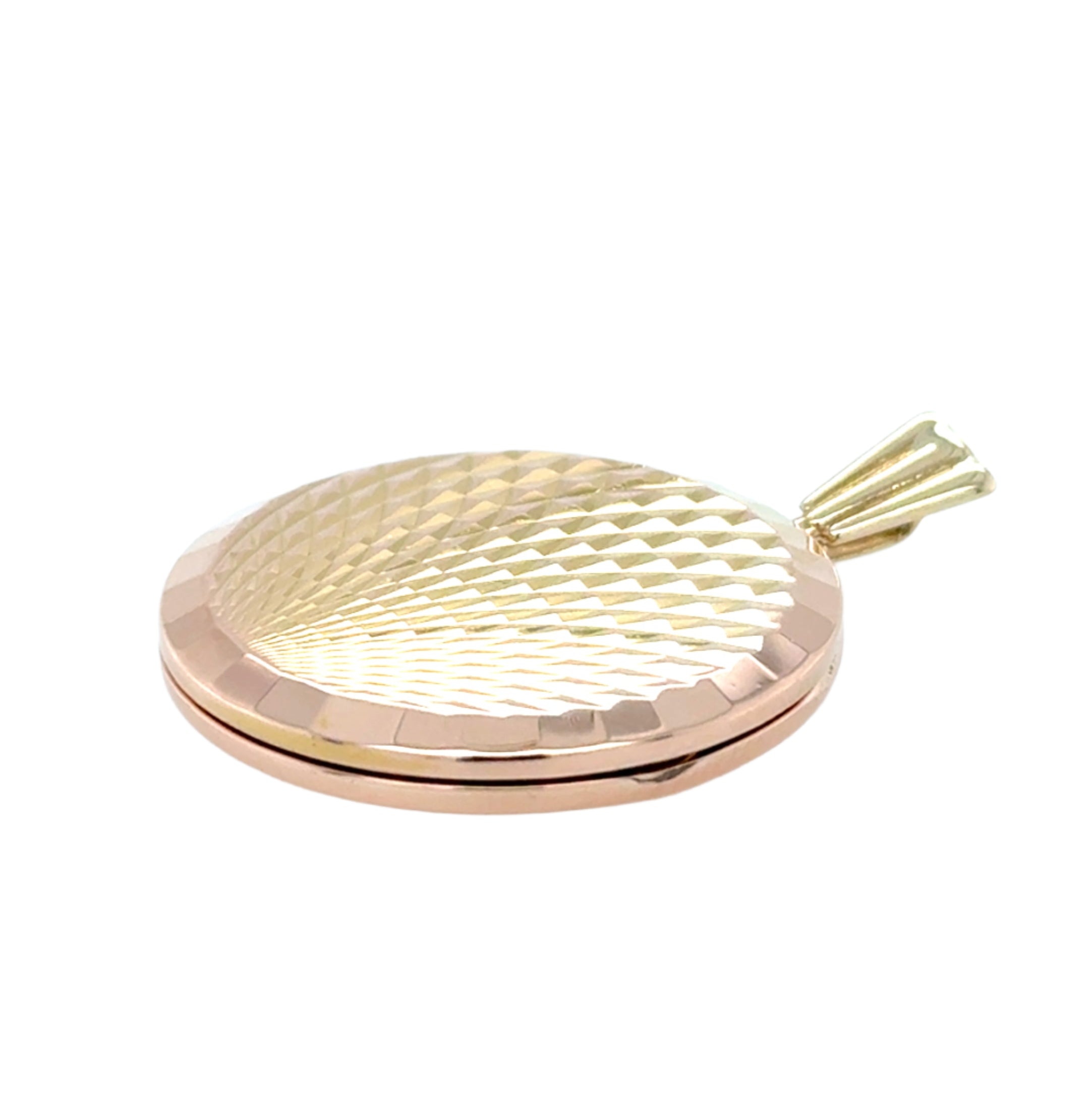 Pre- owned. A vintage 9ct yellow gold locket pendant. Round in shape the front features diamond cut detail with a faceted border edge. The reverse is plain polished. Fitted with a tapered swing bale allowing it to be worn on an chain up to 4mm wide. Hinged opening reveals space for two photographs inside.